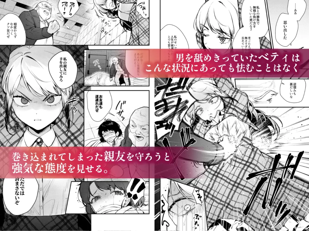 ベディが敗北を認めても男からのしつこい責めが終わることはなく、必死に許しを乞いながら何度もイク姿は最初の強気で勝ち気なお嬢様の面影はないといえるでしょう。